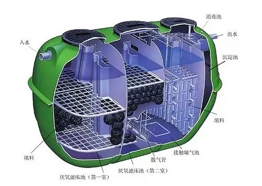 下面的圖展示的是厭氧濾床接觸曝氣工藝小型凈化槽的內部構造。這種工藝是小型凈化槽采用最多的一種,也是安裝數量最多的一種凈化槽。污水通過管道流入厭氧濾床池,由于里面填裝有濾材,污水中的固體雜物的大部分通過濾材時被去除。